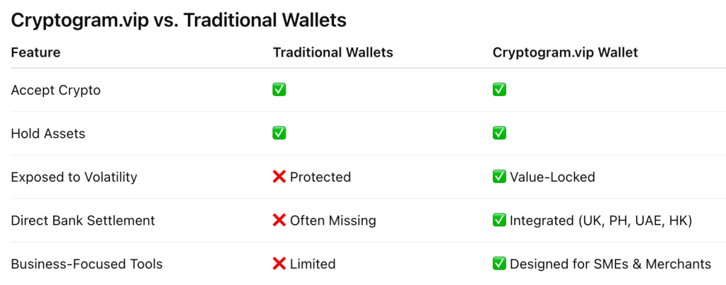 Traditional wallets are useful for traders, but they don’t solve the volatility problem for businesses. Cryptogram.vip was built with SMEs in mind, ensuring that crypto becomes a practical, risk-free payment method.